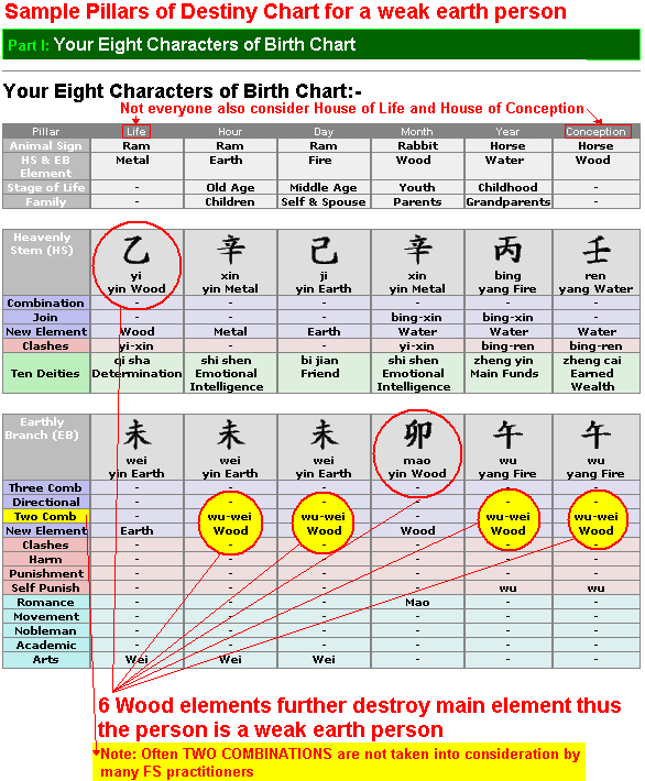 13. However, if you consider the Combination which occur in Hour or Day Earthly  Branch wei and Year Earthly Branch wu. This is a combination that will occur and  because of the favourable conditions it will combine to change the original element from wei-wu (earth-fire) to Wood element. This change reduces the two favourable elements earth and fire and change it to 2 unfavourable element wood which destroy Earth.